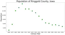 Ringgold County is a county located in the U.S. state of Iowa. As of the 2020 census, the population was 4,663,[1] making it the Iowa county with the second-smallest population. The county seat is Mount Ayr.[2] The county is named after Maj. Samuel Ringgold, a hero of the Battle of Palo Alto fought in May 1846, during the Mexican–American War. It is one of the 26 Iowa counties with a name that is unique across the nation.