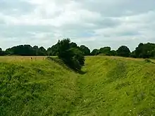The fort stands on the brow of an outcrop of Corallian stone,[1] overlooking Braydon Forest to the west and with excellent views to the south and north; there is less of an incline towards the east. It is believed that to ensure visibility was not impeded the builders cleared all areas, and certainly the land towards the west, from trees. The banks are made from limestone rubble.[2] These are not local rocks, suggesting material was transported to the camp from further afield.