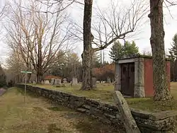 Despite the 1866 establishment of the cemetery, its earliest grave markers have dates from the 1810s. These graves were supposedly moved here from the Ireland Street Cemetery in neighboring Chesterfield; there is evidence of family connections between the two areas. Its most prominent marker is the Blair Vault, located in the northwestern corner, near the front wall. This brick and granite structure bears the inscription "Presented by Clara D. Blair in memory of her husband David Blair." The cemetery is in active use by the town.[2] It was listed on the National Register of Historic Places in 2004.[1]
