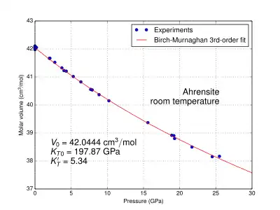 Molar volume vs. pressure at room temperature for ahrensite γ-Fe2SiO4