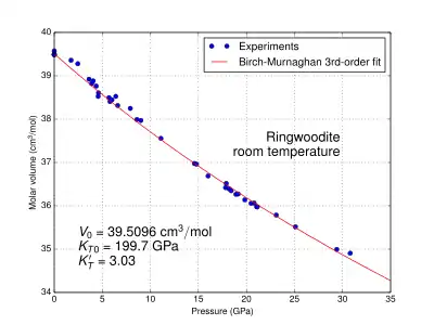 Molar volume vs. pressure at room temperature for ringwoodite γ-Mg2SiO4