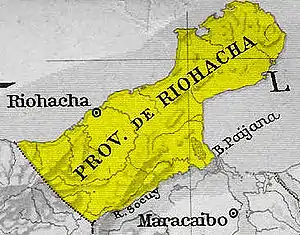 Riohacha Province was a province of Gran Colombia. With the 1824 changes in the subdivisions of Gran Colombia, it became part of Magdalena Department. Riohacha[a] (Spanish pronunciation: [rjoˈa.tʃa]; Wayuu: Süchiimma[b]), is a city in the Riohacha Municipality in the northern Caribbean Region of Colombia by the mouth of the Ranchería River and the Caribbean Sea. Riohacha is the capital city of La Guajira Department.