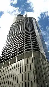 Riparian Plaza is a 53-storey skyscraper located in the central business district of Brisbane, Queensland, Australia. The building stands at 250 m (820 ft) in height to its communications spire and 200 m (660 ft) to its roof. It was Brisbane's tallest building until it was surpassed by Aurora in 2006 and is a particularly iconic building on the Brisbane skyline. It is a mixed use building, with 11 car park levels from the ground up, 25 commercial levels, and 12 residential levels originally housing 50 penthouse apartments.