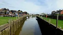 The Commissioners of Sewers for the Levels of Brede and Pett were required, under powers granted by the Rye Harbour Act of 1833, to ensure that Brede Sluice was navigable, and that barges could travel up the river as far as Brede Bridge. This was carried out, as there is evidence that barges operated on the river during the nineteenth century.[16] In 1903, when the Brede Valley Waterworks was being built, materials were transported by barge to a wharf immediately upstream of Brede Bridge.[8] They were unloaded by a steam crane, and transferred to an 18 in (457 mm) gauge tramway, operated by an 0-4-0 saddle tank and four waggons. Coal to power the triple-expansion steam engines continued to be delivered by water until around 1928. 20-ton barges could only reach Brede Bridge on 2 days every two weeks, when water levels were adequate.[17] There was also a brickyard in the vicinity, which was served by a wharf on the south bank of the river below the bridge.[8] There was an entrance lock just to the south of Rye, which had two sets of gates facing in both directions, so that it could be used at most states of the tide. It was suitable for boats which were 40 by 12 feet (12.2 by 3.7 m), drawing 3 feet (0.91 m).[18] By the time of the Land Drainage Act 1930, the land drainage function of the rivers was more important, and from 1933, river levels were reduced.[16] A regulation to abolish the right of navigation became effective in 1934, although boats continued to deliver fuel to the Brede Valley Waterworks until 1935, when a road was built from the village to the works.[8] Navigation is still possible in the winter months, but during the summer, Udimore sluice is used to retain water in the upper river, preventing the use of boats on parts of the river.[18]