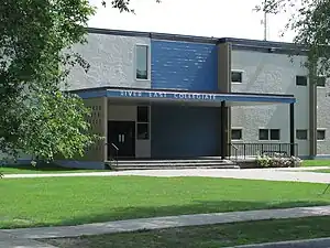 River East Collegiate is a public high school located in Winnipeg, Manitoba, that belongs to the River East Transcona School Division. River East has a school population of approximately 1,250 students. The school colours are blue and white and the school mascot is the Kodiak bear (Kody).