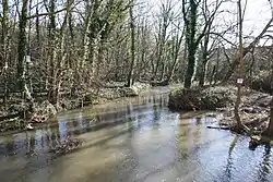 The river rises as a series of springs to the west of Kirklington, close to the 160-foot (49 m) contour. It is joined by Cotton Mill Dyke and Edingley Beck, and to the east of Kirklington, turns to flow in a south-easterly direction. Halam Beck joins from the south, and there is a disused mill at Maythorne Farm.[3] It was built as a cotton mill in 1795 by a hop merchant, to supply yarn to the framework knitting industry. The firm of Messrs. Bean and Johnson altered it in the early nineteenth century, after which silk and lace thread was produced. A small community was established around the mill, with cottages for some of the workers, of whom there were 70 in 1838, a general store, a public house and a mission hall. Willow for making baskets was grown in osier beds, and hops were also cultivated. The building was used as a billet for soldiers during the Second World War, by which time its industrial function had ceased. It has subsequently been converted into flats, with some of the outbuildings used as industrial workshops.[4] There are two mill buildings, the north mill and the south mill, both of which are grade II listed structures.[5][6] Below the mill the Robin Hood Way, a long distance footpath, follows the banks of the river, which forms the northern boundary of Southwell. There is a wildfowl centre on the north bank,[3] and Caudwell flour Mill is on the south bank. It was built over the site of Burgage mill, a medieval building, and was bought by Charles Caudwell in 1851. He increased the capacity of the mill, which was subsequently damaged by fires in 1867, 1893 and 1917. Each time the mill was rebuilt, the equipment was upgraded. The Caudwell family were millers for four generations, after which Associated British Foods bought the mill. It closed in 1977, and was turned into flats in 1989.[4]