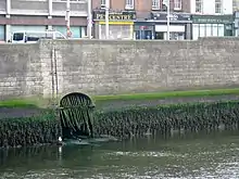 The confluence of the Poddle and the Liffey is visible at lower tides as a grated opening in the Liffey's stone walls at Wellington Quay.[3]