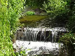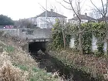 Near Templeville Road, the Poddle used to receive the artificial stream from the direction of Templeogue and Firhouse. This channel, the first stretch of City Watercourse, carried water from the River Dodder extracted at Balrothery Weir in Firhouse; as of 2020, it has been dry for at least two decades.[3] It then passes into Kimmage via Wainsfort Manor, and by Wainsfort Manor Green there is a sluice gate to manage high flow. If the water backs up, some is diverted into what is today the Lakelands Overflow culvert. Historically a surface channel, this now runs underground to cross Wainsfort Road, runs along past the Terenure College buildings and comes out at the western end of the college's lake[10] (the lake, in turn, has a tunnel connection to the River Dodder at Bushy Park, though the lakes in that park, formerly supplied with Poddle water, are now supplied solely from the Dodder itself).[3]