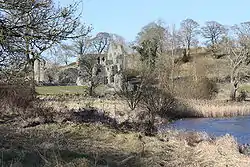 On the north bank of the river, 0.75 miles (1.2 km) north-west of Downpatrick, the Inch Abbey site was originally on an island (Irish: Inis) in the Quoile Marshes. The pre-Norman Celtic monastic settlement here, known as Inis Cumhscraigh (or Inis Cuscraidh),[1] was in existence by the year 800. In 1002 it was plundered by the Vikings led by Sitric,[2] King of the Danes, who came up the Quoile with a fleet from the sea. The Vikings plundered the settlement again in 1149.[1]