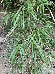 This bamboo is a perennial grass with a rounded, hollow stem which can exceed 7 cm (2.8 in) in diameter and grow to a height of 10 m (33 ft). It grows from a large network of thick rhizomes. The lance-shaped leaves are up to 30 cm (12 in) long and 4 cm (1.6 in) wide. The inflorescence is a raceme or panicle of spikelets measuring 4 to 7 cm (1.6 to 2.8 in) in length. An individual cane has a lifespan of about 10 years.[2][4] Most reproduction is vegetative as the bamboo sprouts new stems from its rhizome. It rarely produces seeds and it flowers irregularly. R.S. Cocks[5] writing in 1908, stated that certain clumps of bamboo near Abita Springs, Louisiana had been blooming annually in the latter part of May for nine years.[6] Sometimes it flowers gregariously.[7] Some types of non-native bamboos are confused with this native cane.[8]