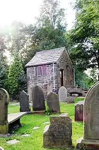 The belltower, a Grade II Listed building in the churchyard close to the church, is a small, square, single-storey building with a basement and outside steps built in sandstone with a stone slate roof. It was built to hold a large bell bought from All Saints' Church, Wigan in 1542.[21] The bell was sold by church commissioners around 1551.[22] The detached bellhouse, the only such structure in Lancashire, was used as a charnel house but is now used as a tool house by the sexton and grave digger.[23]