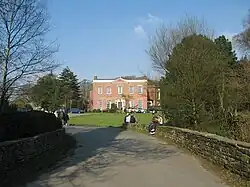 The 15th-century wood and wattle and daub structure was demolished and the hall rebuilt in stone and extended from the end of the 17th century.[1] The oldest part of the hall is dated 1694 WB (William Breres) over a rear door on the west side. The date 1700 and WBM (William Breres and Martha) is on the north wing. The oldest parts of the hall are to the rear where the ground floor is built of sandstone rubble with quoins whilst the upper storey is built of coursed squared sandstone indicating a later date.[1] The oldest parts contain mullion windows.[12] The stables to the east of the house were dated 1713 WBMI (William and Martha Breres and John) and 1732 IAA (John Andrews and Abigail).[12] The date stones are now in the chapelyard of Rivington Unitarian Chapel.[17] The halls west front is a symmetrical red brick, two-storey structure built in the classical Georgian style with five bays and a pedimented centre and stone parapet hiding the roof which has a chimney in each gable. The central doorway, approached by a flight of four stone steps, is flanked by side lights and has a pediment. At ground floor level there are four tall, 15-pane sash windows and on the floor above five shorter 12-pane sashes with splayed heads.[1] The spout heads bear the date 1774 RA (Robert Andrews). The south wing was built in brick in the 19th century and was mostly demolished and rebuilt by Robert Andrews in 1774, incorporating some of the older stone building, with a red-brick Georgian frontage.[12]