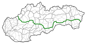 Road I/50 was a first class road in Slovakia. It was the longest numbered road in Slovakia, with a total length of 403,8 km[1] and it crossed the country from the northwest to the east. Road sections were the parts of European roads E50, E58, E71, E77, E571 and E572. Expressway R2 is planned to be constructed on the most parts of the road section to relieve the rising traffic. Most of the road part is two laned, ca. 20 km section between Žiar nad Hronom and Zvolen is four laned plus emergency lane in both directions and a section between Nováky and Prievidza. Also before entering Košice is ca. 17 km long four laned section. The road crosses Trenčiansky, Banskobystrický and Košický kraj.