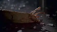 The episode was directed by Rod Hardy, making it his first credit for the series.[9][10] Hardy was offered the role after an unknown individual working at The X-Files saw his TBS remake of the film High Noon.[11] The parasitic creature that was used in the episode was created using animatronics[6] and was designed to look like a banana slug.[3] During the scene where the creature is inserted into Scully's back, the production crew created a false fiberglass back for Gillian Anderson. To create the illusion that the creature was crawling up the body, the fiberglass was placed on top of Anderson, and then the animatronic slug was pressed against the fake back.[6] Anderson later described the scene as "fun to shoot", although she also called it "exhausting" because she had to struggle on the bed, all the while tied down, with her arms being attached to the headboard and her legs to the footboard.[7] Paul Rabwin later noted that he had several cameramen "start to lose it" during the scene.[6][7]