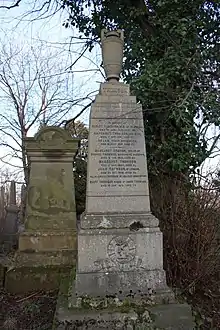 He was originally interred in Blackfriars Churchyard, but the body had to be moved in 1875 when a railway was built through the churchyard. He was reburied in Craigton Cemetery with a monument designed by Greek Thomson and sculpted by John Mossman.[7] The graves lies near the south-west corner within the second row from the south path.