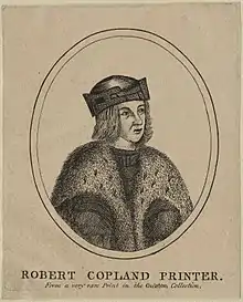 Robert Copland (fl. 1508–1547), English printer and author, is said to have been a servant of William Caxton, and certainly worked for Wynkyn de Worde. The first book to which his name is affixed as a printer is The Boke of Justices of Peace (1515), at the sign of the Rose Garland, in Fleet Street, London. Anthony à Wood supposed, on the ground that he was more educated than was usual in his trade, that he had been a poor scholar of Oxford.