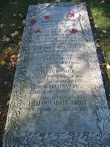 Elinor and Robert Frost had six children: son Elliott (1896–1900, died of cholera); daughter Lesley Frost Ballantine (1899–1983); son Carol (1902–1940); daughter Irma (1903–1967); daughter Marjorie (1905–1934, died as a result of puerperal fever after childbirth); and daughter Elinor Bettina (died just one day after her birth in 1907). Only Lesley and Irma outlived their father. Frost's wife, who had heart problems throughout her life, developed breast cancer in 1937 and died of heart failure in 1938.[18]