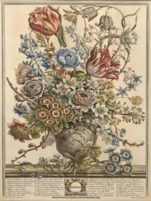 Furber's most notable work was Twelve Months of Flowers, published in 1730. The book was written as a catalog of plants and seeds, and featured twelve detailed engravings of seasonal plants in bloom. Henry Fletcher produced each of the twelve hand-colored engravings from paintings by Pieter Casteels. Each plant was numbered, with a list of the corresponding species names provided. More than 400 different species of plant were featured.[1] The plates were originally sold on a subscription basis for £1 5s in uncolored form, or £2 12s 6d for a colored version.[3] The book was reprinted in 1982.[4]
