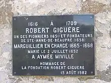 It is certain that Robert Giguère was in New France in 1651. However, according to George-Emile Giguère and others, in 1644, he was missing from French census records. Indeed, he could have arrived as early as 1642.[2]