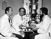 Robert Purcell, Albert Kapikian, and Stephen Feinstone around an electron microscope