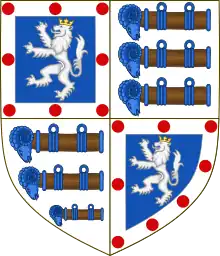 Arms of the Earl of Northington: Quarterly: 1st and 4th: Azure, a lion rampant argent ducally crowned or a bordure of the second charged with eight torteaux (Henley); 2nd and 3rd: Argent, three battering rams proper armed and garnished azure (Bertie).