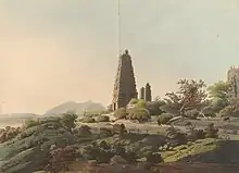 Pagodas at Maugry, with a distant view of Sewandroog, a print after Colebrook
