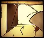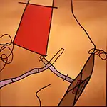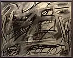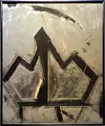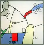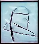 His leaded “Compositions” are more akin to paintings or drawings than to traditional stained glass. They have been described as narratives at once “spontaneous, lyric, grotesque and humorous.”[7] Biomorphic forms, quirky lines and childlike scribbles, at times derived from his son's crayon drawings, add to the surreal atmosphere.[8] A crossed-out triangle in one of the works “appears a casual enough gesture, but the assumption of nearly a thousand years of stained glass, that the nature of line is to delineate shape, is challenged by that childlike scrawl.” [9] These Compositions “quietly demolished more than a few of the restrictive preconceptions surrounding his media.”[1]