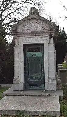 He is interred in Kensal Green Cemetery, in Grade II listed portland stone with bronze door mausoleum.[9]
