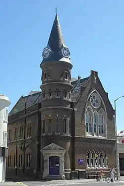 Leaf Hall in Eastbourne was designed and built in the continental gothic style in 1863–64 as a working men's institute for the philanthropist William Leaf. Its facilities included a coffee room, lending library and reading room, smoking room, skittle yard and a lecture room capable of seating 200 people. In the absence of a local theatre the hall was used for staging visiting shows, including General Tom Thumb in 1865. It now serves as a community arts centre and is a grade II listed building.[2]