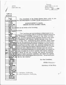- ↑ Forrestal, James (October 14, 1946). "Robert Maze Distinguished Flying Cross Citation.png". United States Department of the Navy. Retrieved November 26, 2020.