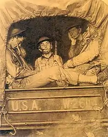 Rockwell produced at least one depiction of Gillis that was not on the cover. The painting Willie Gillis in Convoy was produced in 1943, depicting Gillis, in combat gear, in the back of a covered military vehicle with his rifle in hand. Rockwell donated the painting to the Gardner High School for the graduating class, where it hung in the principal's office until 2000. The school then loaned it to the Gardner Museum. A charcoal sketch of the painting sold for $107,000 in 1999.[29] There was concern that the painting was not hung in a secure location. In 2005, the painting was restored and rehung at the high school.[30] In 2014, it was sold for $1.9 million, with the proceeds used to create a foundation to benefit the schools in Gardner.[31]