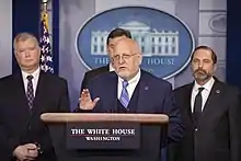 Redfield became the Director of the U.S. Centers for Disease Control and Prevention on March 26, 2018.[15] He was appointed to the post by President Donald Trump, after the president's first appointee, Brenda Fitzgerald, resigned in scandal.[16] His appointment was considered controversial; he was publicly opposed by the Center for Science in the Public Interest and Patty Murray, the ranking Democrat on the Senate health committee, but supported by Kathleen Kennedy Townsend and some advocates for AIDS patients.[17][18][19][20] In his inaugural address to the CDC, Redfield called the agency "science-based and data-driven, and that's why CDC has the credibility around the world that it has".[15]
