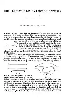 - "We have there endeavoured to show that a knowledge of geometrical construction is necessary, before a thorough appreciation of the principles of outline sketching can be obtained, and a ready facility acquired in performing its operations. However much this position may be controverted as regards its application to an art which is generally looked upon as independent of, rather than dependent on, strict and formal rules, there can be no doubt, we think, that it holds with all completeness in reference to that which it is now our duty to illustrate and describe. In fact, so much do the various branches treated of in the following pages depend upon a knowledge of geometry, that many class them under the generic title of "geometrical drawing." Those commencing the study of these arts – so useful to the architect and the mechanic – without this knowledge of geometry, will be disappointed as to their speedy proficiency, and will labour under great disadvantages, from not understanding the principles upon which the constructions are founded."[12]