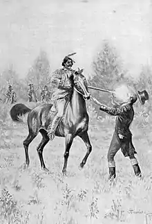 It is not clear whether Semple was reaching for Boucher's gun, or his horse's bridle. But, while Semple was reaching for him, Boucher dismounted his horse and began running back to his side. Boucher's account differs slightly, in that Semple and his men disarmed him, and that his horse took flight and that he was fired upon while riding the frightened animal away.[5] One of Semple's men fired his gun, which triggered the fighting. Within 15 minutes nearly everyone from Semple's group was either injured or dead.[4]