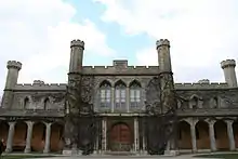 The rapid rise of Smirke was due to political patronage.[13] He was a Tory at a time when this party was in the ascendant. His friends at the Royal Academy, such as Sir Thomas Lawrence, George Dance, Benjamin West and Joseph Farington, were able to introduce him to patrons such as: The 1st Marquess of Abercorn; The 1st Viscount Melville; Sir George Beaumont, 7th Baronet; The 4th Earl of Aberdeen; The 3rd Marquess of Hertford; The 3rd Earl Bathurst; John 'Mad Jack' Fuller, and The 2nd Earl of Lonsdale. These politicians and aristocrats ensured his rapid advancement and several were to commission buildings from Smirke themselves. Thomas Leverton Donaldson described Smirke as able to please "Men whom it was proverbially impossible to please".[14] His patron at Lowther Castle, The 1st Earl of Lonsdale, said he was "ingenious, modest and gentlemanly in his manners".[15]