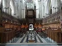 - York Minster after the arson attack on the chancel of the cathedral in 1829, Smirke oversaw the restoration (1830–32),[46] which involved rebuilding the roof and vaults plus the recreation of the choir stalls