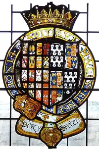 The arms of "Spencer of Spencer Combe" as quartered by the Percy Earls of Northumberland, visible in the Percy Window in the chapel at Petworth House and by the Cary Viscounts Falkland[15] are: Sable, two bars nebuly ermine. Sir William Pole, however, gives the arms of Spencer of Spencer Combe as:[16] Argent, on a bend sable two pairs of keys or.