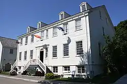 The front facade has a two-sided stairway leading to a small entry porch.[2] The entrance door is flanked by sidelights[2] and pilasters.[4] The multiple windows have small panes.[4]