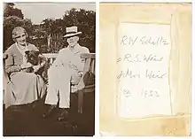 He was born in 1860 in Port Glasgow as Robert Weir Schultz, the son of Henry Schultz, a Greenock sugar refiner, and Isabella Small Weir, the daughter of Dr Robert Weir of Galashiels. Due to this family connection, when Henry Schultz died in 1863 the infant Robert was sent to Galashiels to be raised by his aunt Jane, the wife of Dr Alexander Cunningham Tweedie.[1] Of German roots, he was subjected to anti-German hysteria during WWI. He added his mother's maiden name as an additional surname in 1915 and was from then known as Robert W. S. Weir or R. W. S. Weir, thus hiding his German surname.[2]