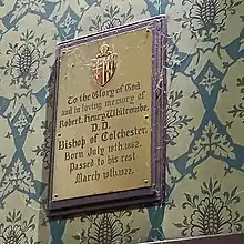 The Rev Robert Henry Whitcombe (18 July 1862–19 March 1922) was an eminent Anglican Bishop.[1] Educated at Winchester and New College, Oxford, from 1886 to 1899 he was a schoolmaster at Wellington College and then Eton. After this he was Rector of Hardwick, Buckinghamshire[2] and then Vicar of Romford[3] before a 13-year spell as Bishop of Colchester from 1909.[4] A memorial window and plaque to him is situated on the south wall of St Mary-at-the-Walls, Colchester.[5]