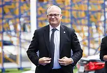 In August 2019 tensions grew within the populist government, leading to the issuing of a motion of no-confidence on Prime Minister Giuseppe Conte by the League.[24] After Conte's resignation, the national board of the PD officially opened to the possibility of forming a new cabinet in a coalition with the M5S,[25] based on pro-Europeanism, green economy, sustainable development, fight against economic inequality and a new immigration policy.[26] The party also accepted that Conte may continue at the head of a new government,[27] and on 29 August President Sergio Mattarella formally invested Conte to do so.[28] On 5 September 2019 Gualtieri was appointed Minister of Economy and Finance.[29]
