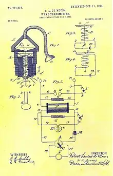 - Patent no. 771,917, "Wave-Transmitter", issued October 11, 1904 for an application filed February 9, 1903 (serial no. 142,440). This was for a dual-use transmitter, capable of making audio transmissions by both the photophone method and via electro-magnetic radiation (radio waves). In the patent, Landell noted that: "It will be observed that the most important feature of my invention consists of the employment of a make-and-break transmitter worked by sonorous vibrations, causing transmitted electro-magnetic or light waves to correspond closely to the sound-waves by which they are produced."