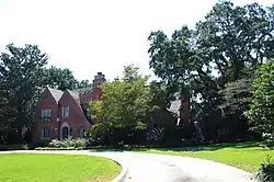 The Roberts House is a historic Tudor Revival style residence and two dependencies in Mobile, Alabama, United States. Built in the 1920s upper-class suburb of County Club Estates, the complex was designed by J. F. Pate. The rambling two-story red brick mansion was completed in 1929.[1] The exterior architecture features steeply pitched gables, prominent chimneys, casement windows, and an elaborate Tudor arch door surround.