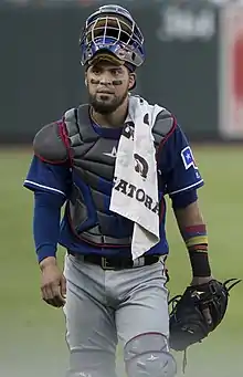 Chirinos started for the Rangers again in 2015 and batted .232/.325/.438 in 78 games.[7] In the ALDS against the Toronto Blue Jays, Chirinos went 3-for-11 (.273) with one home run in 3 games played in a series loss. In 2016, he batted .224/.314/.483 with 9 home runs and 20 RBI in 57 games.[7] That season Chirinos allowed 22 stolen bases, as he caught 8 runners, for a caught-stealing percentage of 27%.[7] In 2017, Chirinos allowed 46 stolen bases, as he caught 15 runners, for a caught-stealing percentage of 25%.[7] He also slashed .255/.360/.506 with 17 home runs and 38 RBI in 88 games.