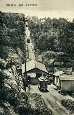 The alpine-style funicular of Rocca di Papa was inaugurated on 12 August 1907 (although it had already entered service on 10 October 1906). It connected "Valle Oscura" to "Viale Silvio Spaventa" and worked on the water-ballast counterbalancing principle, which was also regulated according to the number of passengers.