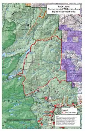 A roadless area is the designation for backcountry, undeveloped lands having wilderness attributes as specified in the Wilderness Act of 1964 and that could be considered for inclusion in the National Wilderness Preservation System. The Rock Creek area was inventoried in the Roadless Area Review and Evaluation process (RARE II) and managed under the land management plans of the US Forest Service. The Roadless Area Conservation Rule was a federal regulation that was adopted by the U.S. Forest Service shortly before President William Clinton left office on Jan. 12, 2001. It allowed reasonable exceptions for management activities like fire suppression and other public health safety measures, and permitted projects, such as grazing and mining, with valid existing rights to proceed.[2] At the same time, the national roadless rule attempted to conserve fish and wildlife habitat while not closing any existing access to these lands.[3] At issue are 58.5 million acres (236,000 km²), located in 42 states, but primarily in the West. Within 24 hours of taking office, President Bush's appointees began their campaign, with the timber industry, to undo this new rule. In May 2005, the Bush administration repealed the Roadless Rule, replacing it with a process that allows governors to petition the Forest Service for protection of the national forest roadless lands within their states, but giving the federal government the power to reject the petitions. The states of California, Oregon, New Mexico, and Washington successfully challenged the Bush roadless rule, resulting in reinstatement of the Clinton rule in 2006, the Roadless Area Conservation Rule was re-established. This rule set national guidelines limiting backcountry timber harvest and road construction and reconstruction with a goal of upholding the roadless characteristics found on millions of acres of inventoried roadless areas. The state of Wyoming and the Colorado Mining Association are currently involved in a lawsuit with the 10th U.S. Circuit Court of Appeals on the basis that the 2001 federal rule banning construction of new roads on National Forest land violates the law.[4]