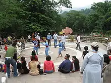Ganga Maya Park is further down the road, about 3 kilometres (1.9 mi) from the Rock Garden. Named after an innocent victim of police firing during the GNLF agitation, "it meanders down the course of a chortling mountain stream, past gazebos, clumps of flowering shrubs and trees, over humped backed bridges under which koi-carp coruscate, and into a circular lake with paddle boats and a waterfall."[4] It has a small lake where boating facilities are available.[2] Gorkha folk dances are performed to entertain the tourists.