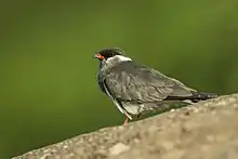 The rock pratincole (Glareola nuchalis) is a native African wading bird. Mature adults have dark gray or brown plumage with a white line beginning beneath the eye extending to the back of the neck like a collar. Their wings are long and dark with a distinct white patch on the underwing. Their tail is forked and they usually have a white belly. The bill is black with a red base and the legs and eyes are coral red. Both sexes emit a faint whistling contact call and musical purring but can become very noisy when aggressive.[5] Glareola nuchalis measurements: length: 16.5–19.5 cm; wing: 14.3–16.0 cm; bill: 10-12mm; tail: 5–6 cm; mass: 43–52 grams.[6]