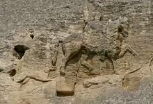 A rock relief or rock-cut relief is a relief sculpture carved on solid or "living rock" such as a cliff, rather than a detached piece of stone. They are a category of rock art, and sometimes found as part of, or in conjunction with, rock-cut architecture.[1] However, they tend to be omitted in most works on rock art, which concentrate on engravings and paintings by prehistoric peoples. A few such works exploit the natural contours of the rock and use them to define an image, but they do not amount to man-made reliefs. Rock reliefs have been made in many cultures throughout human history, and were especially important in the art of the ancient Near East.[2] Rock reliefs are generally fairly large, as they need to be in order to have an impact in the open air. Most of those discussed here have figures that are over life-size, and in many the figures are multiples of life-size.