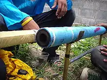 Related to the Chinese Fire Arrow, Bang Fai are made from bamboo bongs. Most contemporary ones, however, are enclosed in PVC piping, making them less dangerous by standardizing their sizes and black-powder charges (which contest rules require be compounded by the rocketeers, themselves). Baking or boiling a bong kills insect eggs that otherwise hatch in dead bamboo and eat it, inside out. Skipping this step may cause the bong to disintegrate and melt the PVC piping. Vines tie long bamboo tails to launching racks. The time it takes for the exhaust to burn through the vines (usually) allows a motor to build up to full thrust; then the tails impart in-flight stability. Ignition comes from a burning fuse or electric match.
